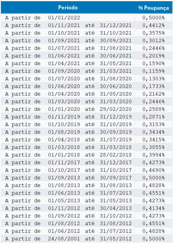 - 0,5% (cinco décimos por cento) ao mês, enquanto a meta da taxa Selic ao ano, definida pelo Banco Central do Brasil, for superior a 8,5% (oito inteiros e cinco décimos por cento); ou